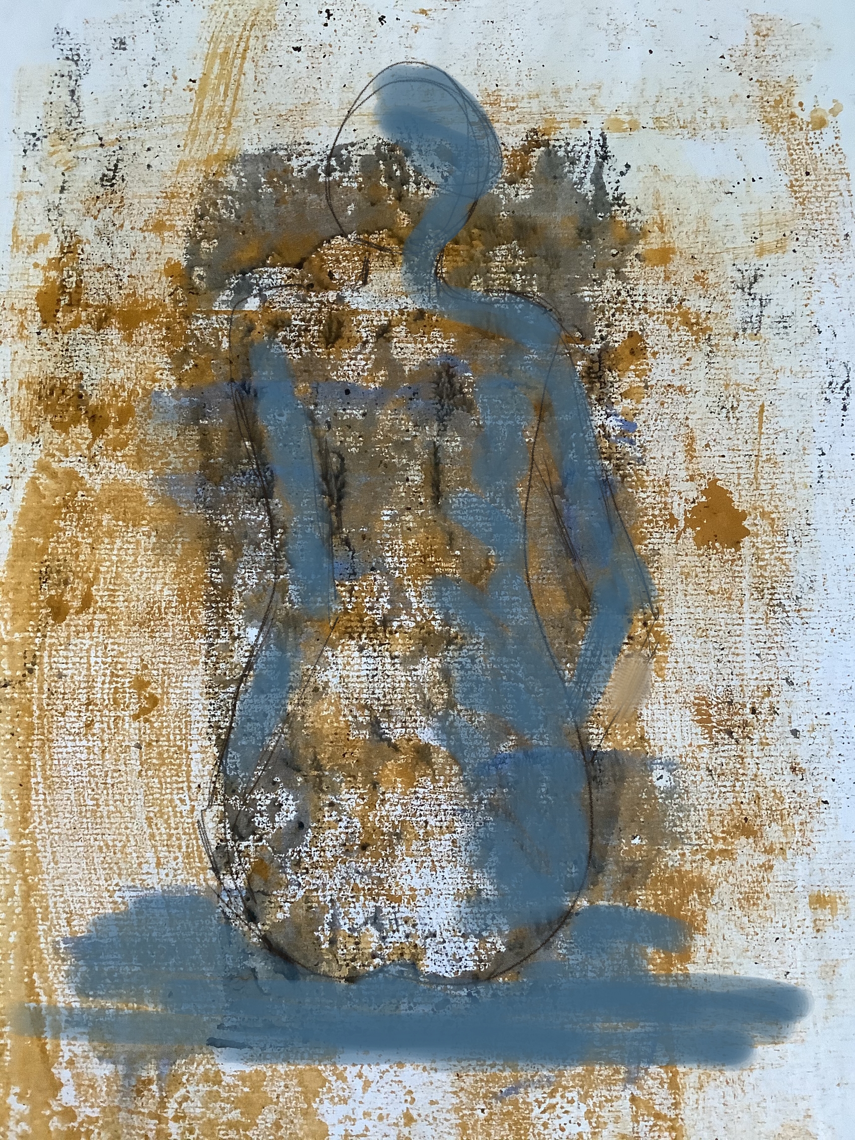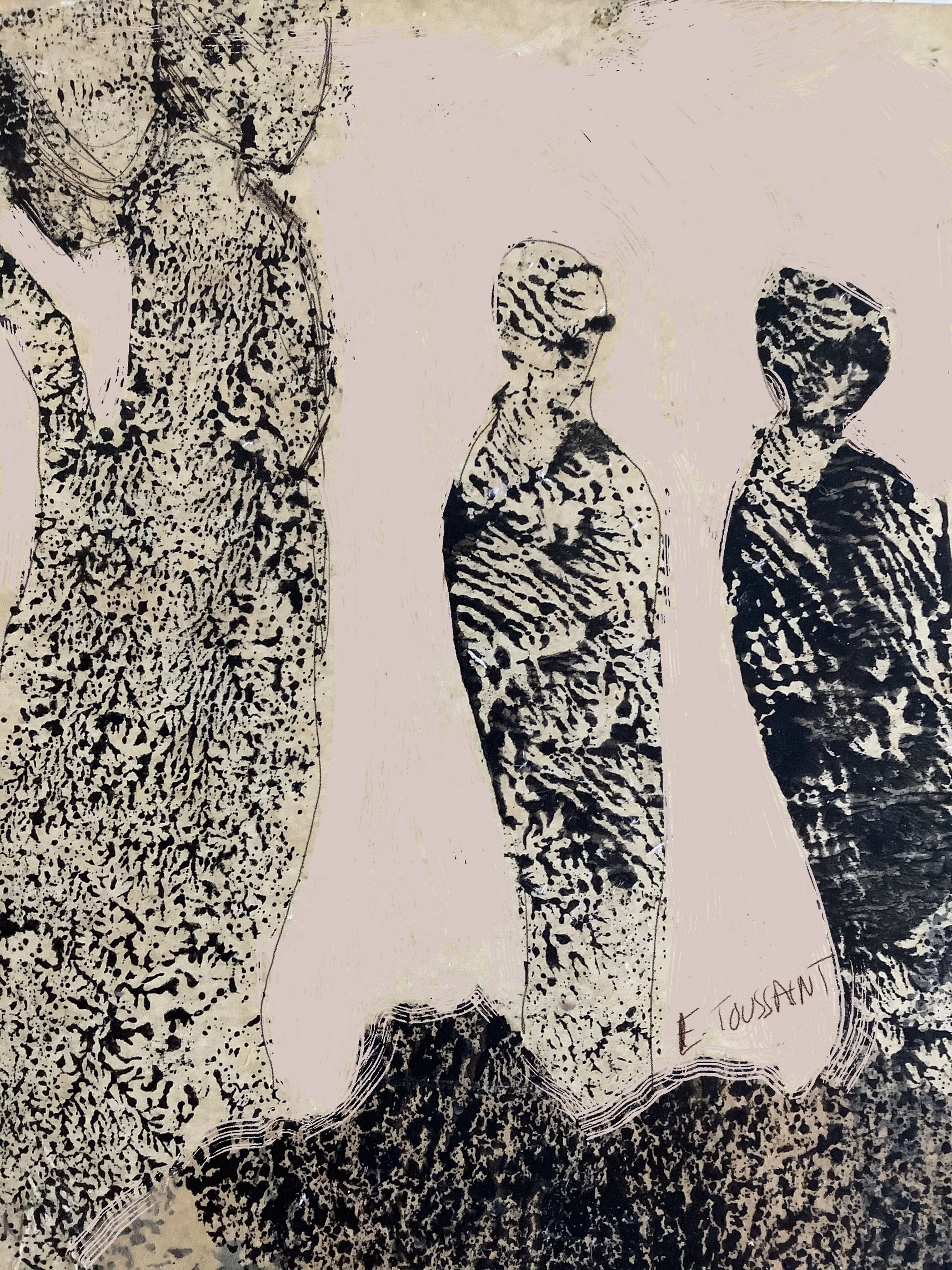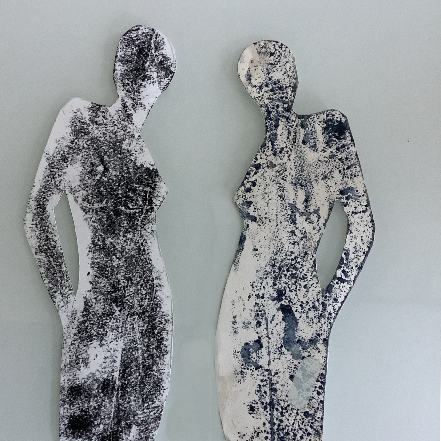 Les fonds des tableaux sont peints à l’acrylique et encre avec graphismes et empreintes. Les silhouettes dessinées sur papier de soie ou directement sur les supportS peints.