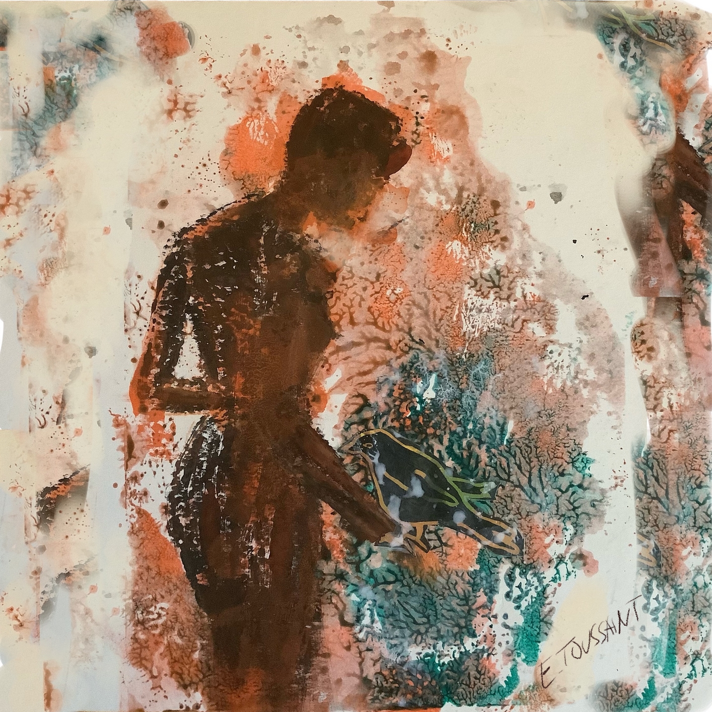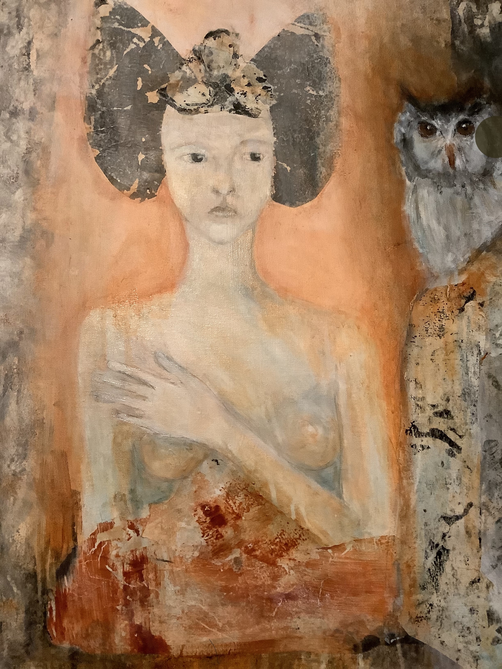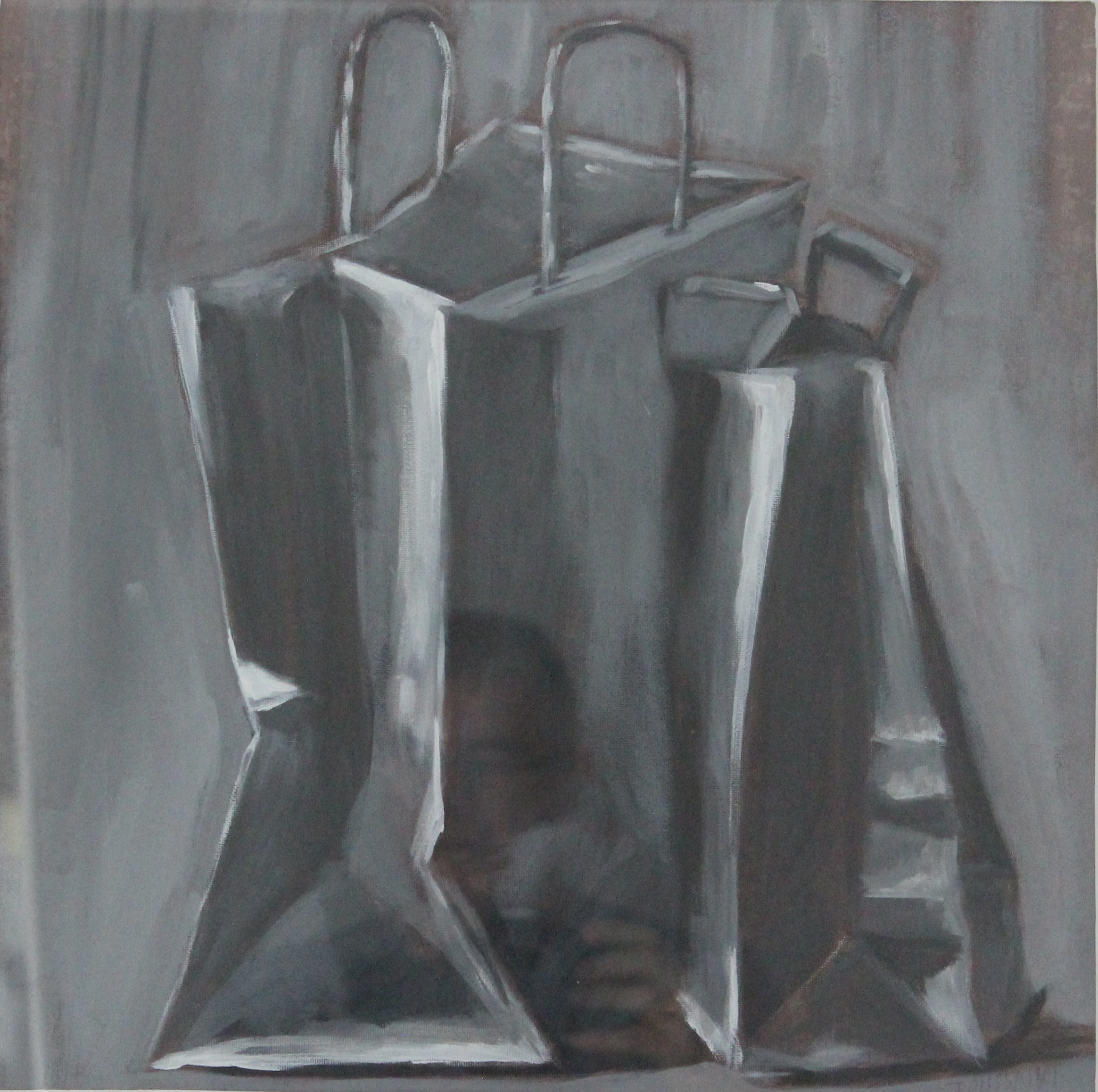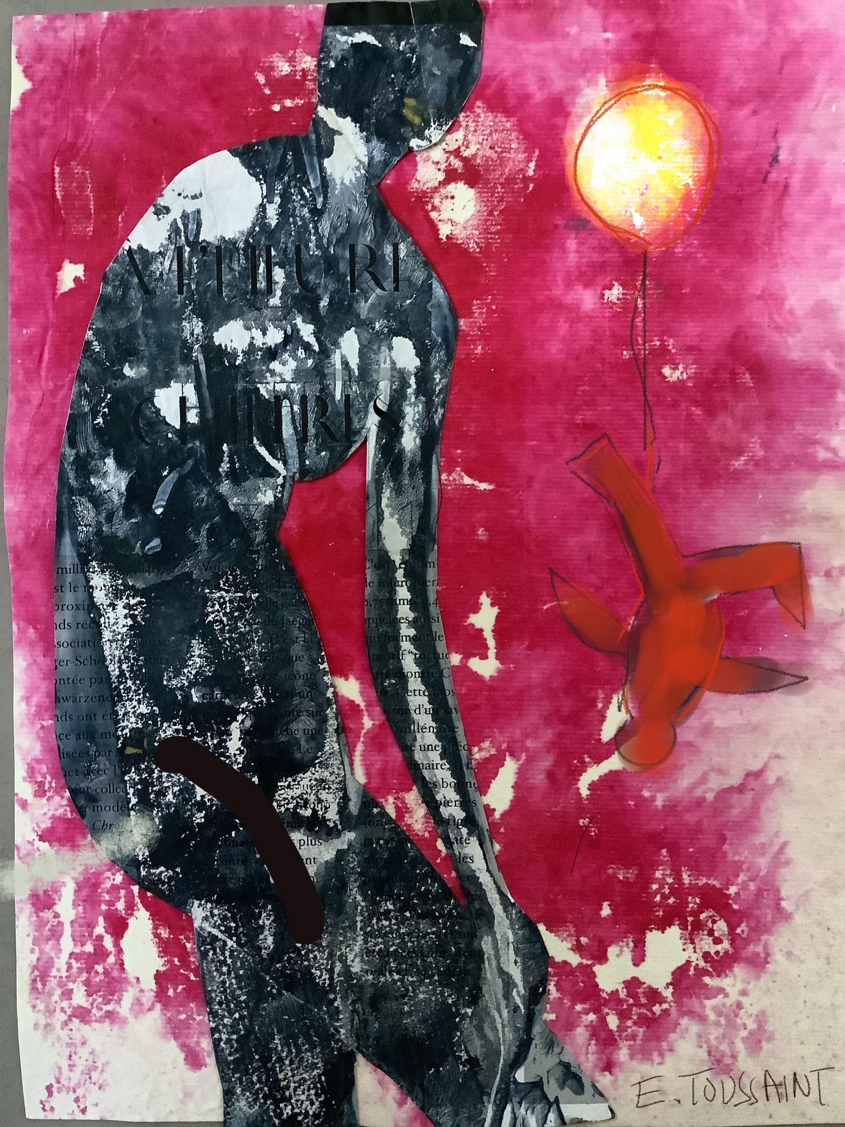 Les fonds des tableaux sont peints à l’acrylique et encre avec graphismes et empreintes. Les silhouettes dessinées sur papier de soie ou directement sur les supportS peints.