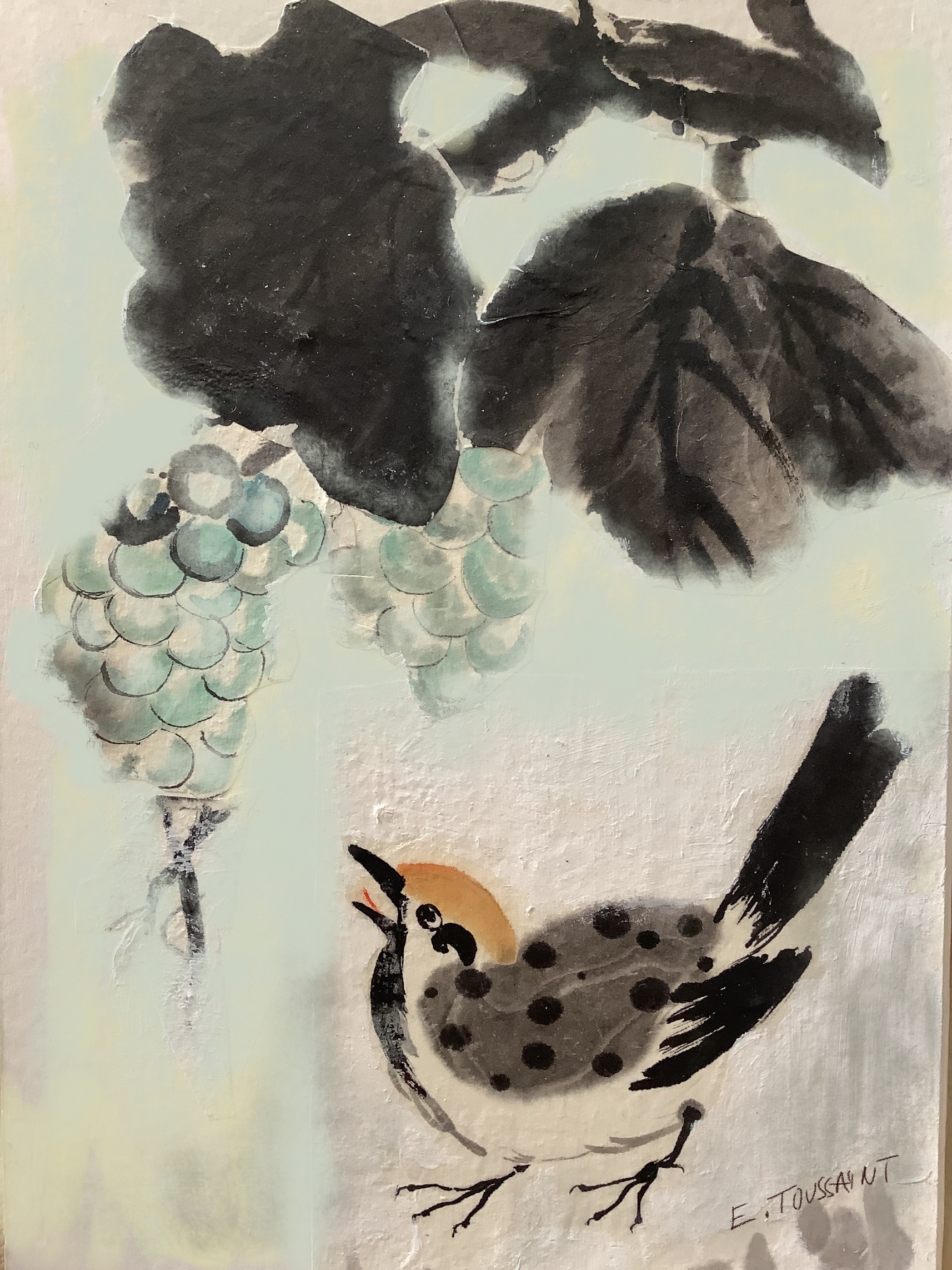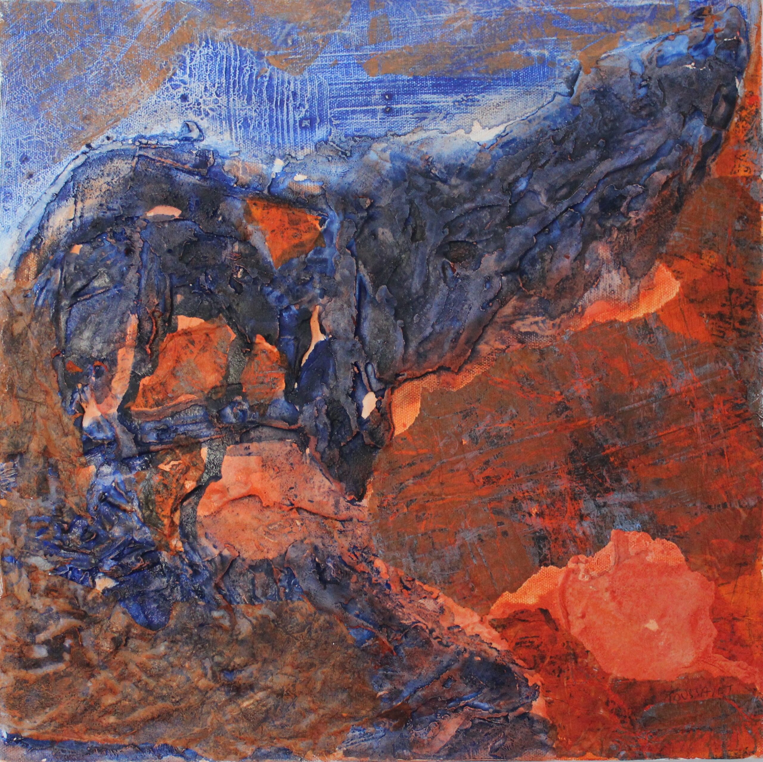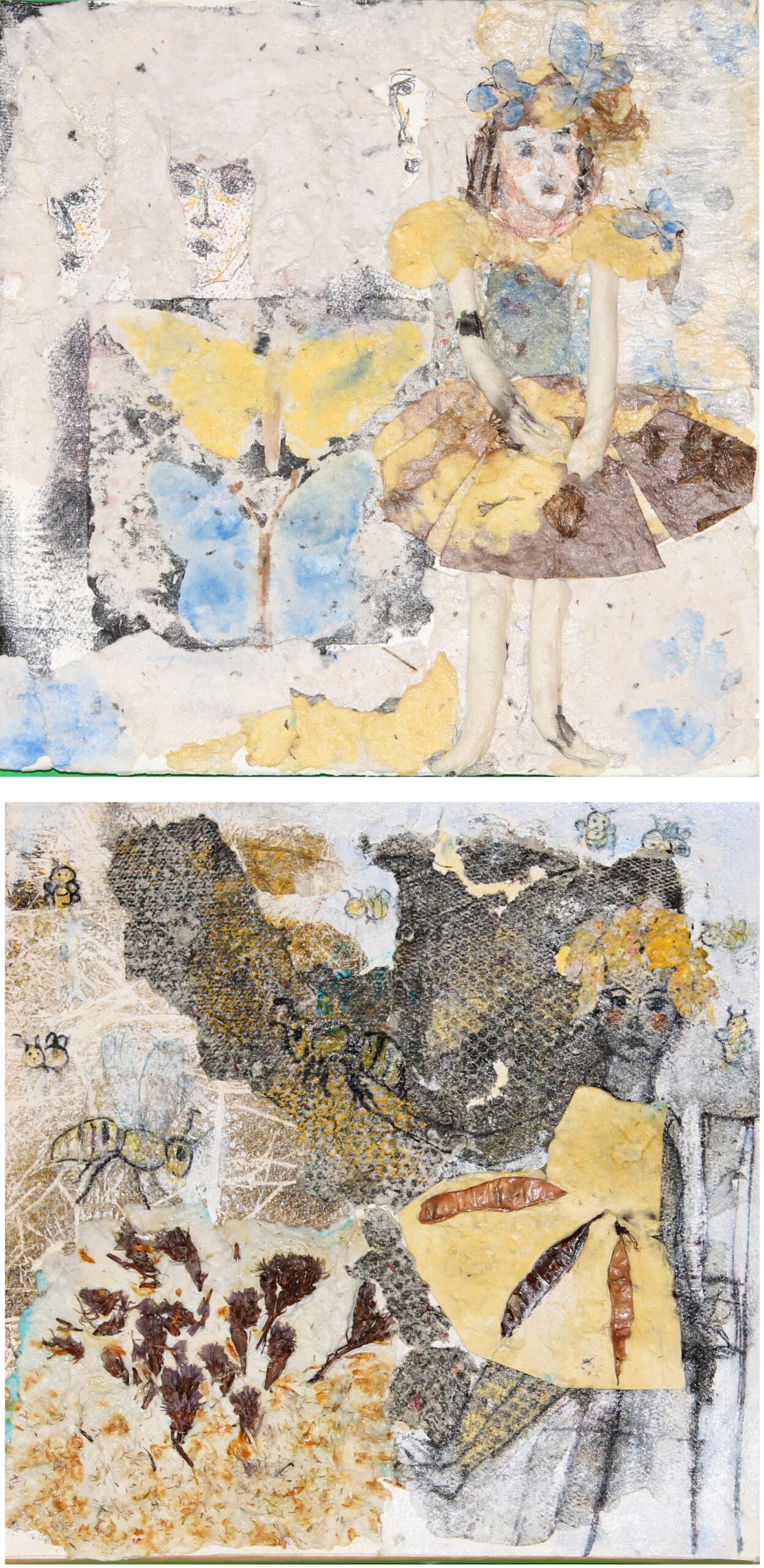 La technique mixte est un Ensemble de collages, de papiers (faits mains par mes soins) et papier chinois, préalablement peints ou préparés par des empreintes, estampes et textures. Marouflage de papiers avec inclusions de végétaux.